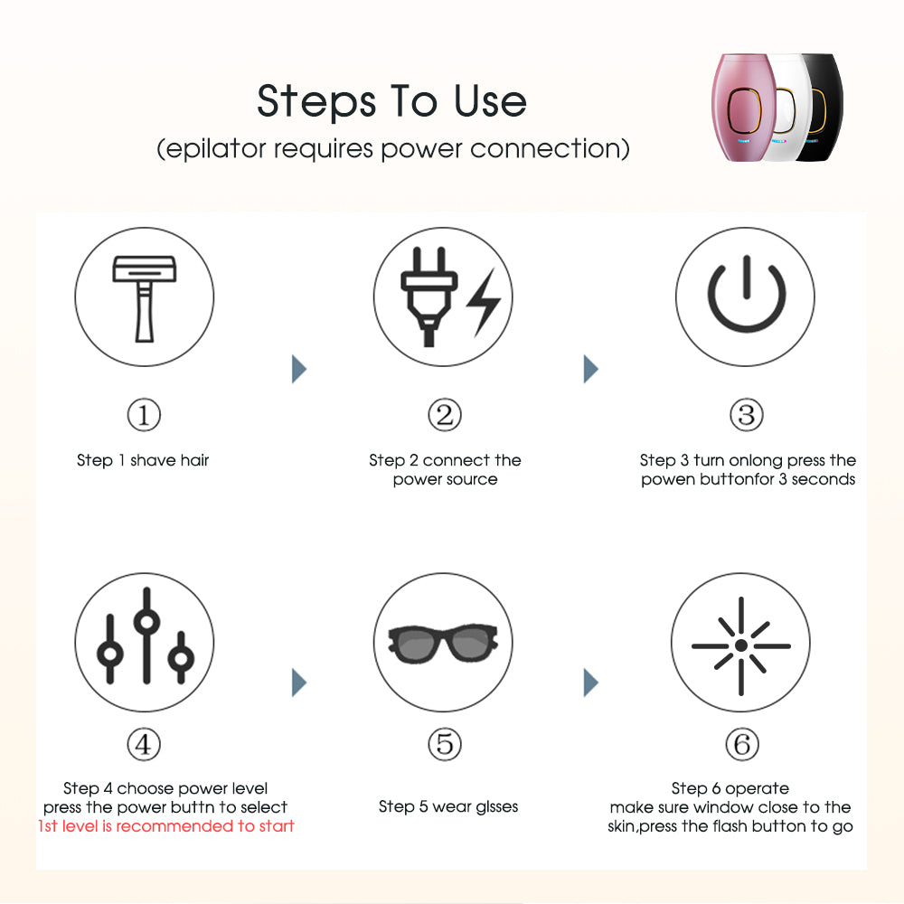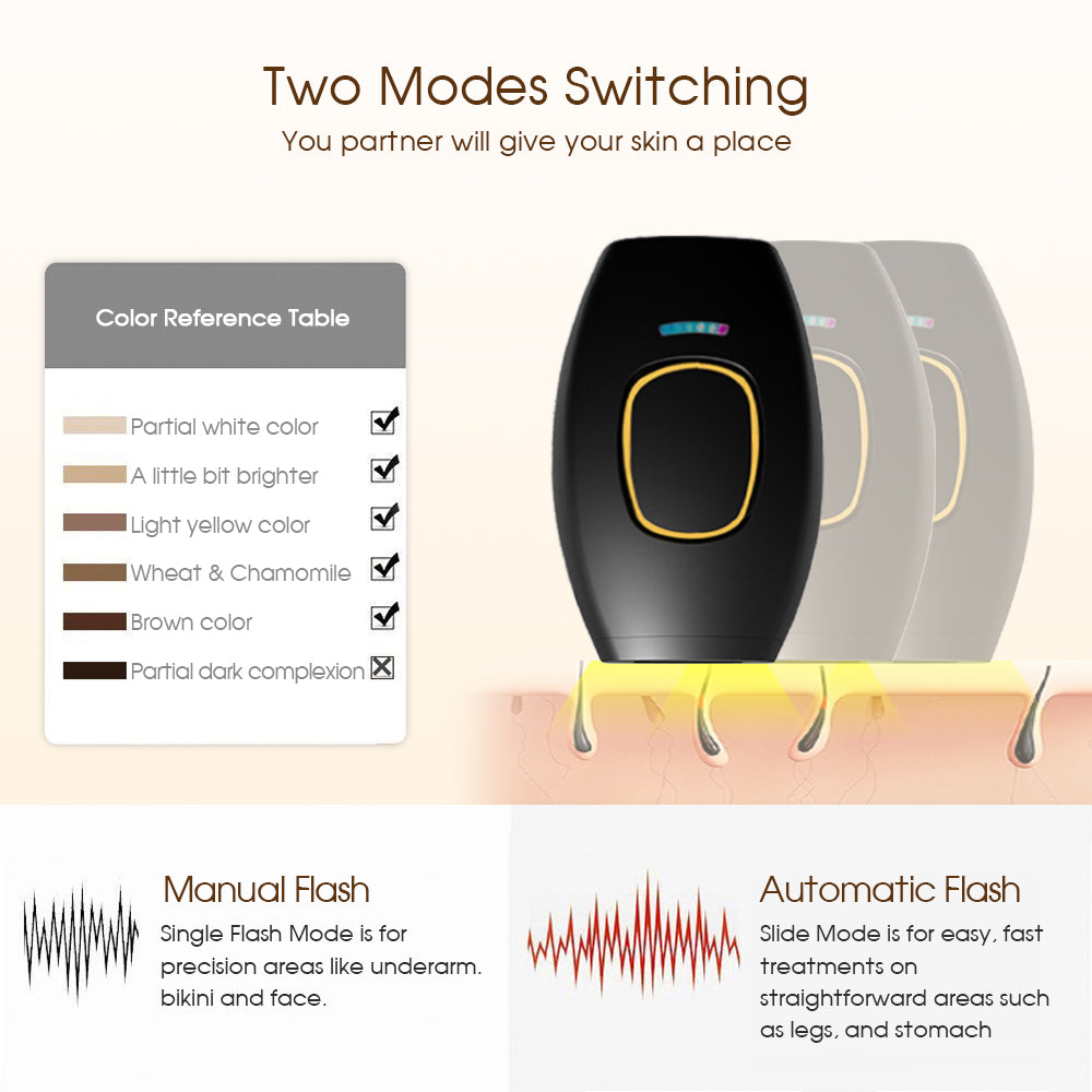 Adjustable Energy Levels: The device features multiple energy levels, giving users the flexibility to choose the appropriate intensity for their skin type and sensitivity. It allows for personalized hair removal sessions tailored to individual needs.